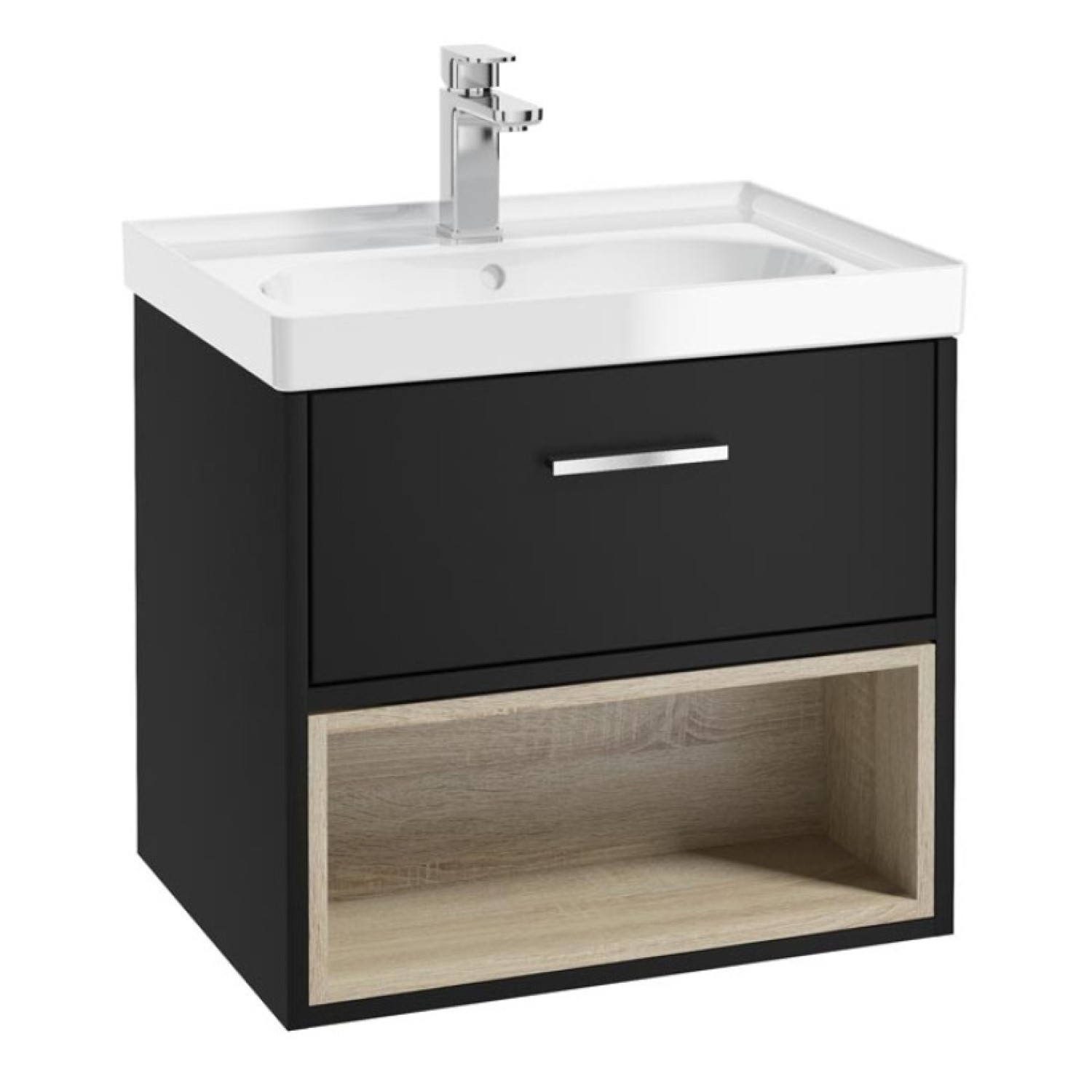 MALMO 60cm Matt Black Single Drawer Vanity Unit Gloss Basin – Brushed Chrome Handle